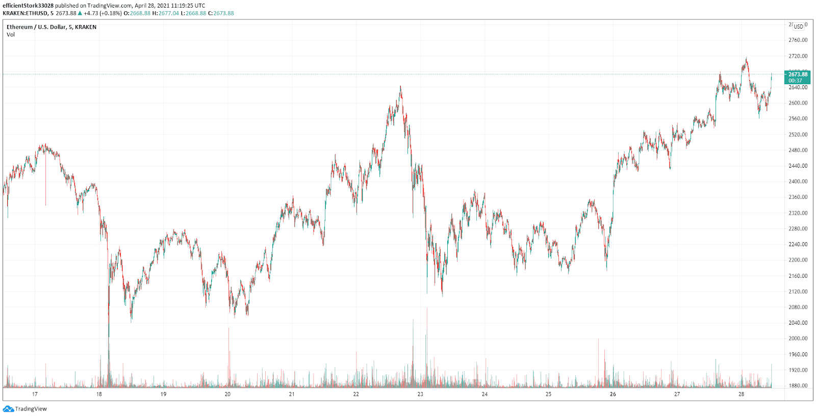 After it spent last weekend fluctuating up and down between $2100 and $2360, Ethereum started skyrocketing late on April 25th. It went from $1173 to $2453 in a matter of hours. After this rapid jump, the coin continued going up, although more steadily.