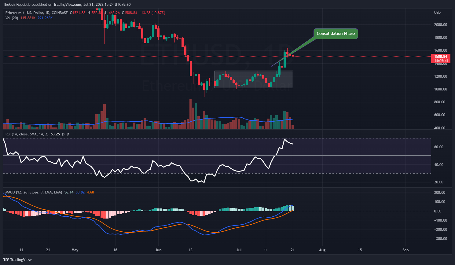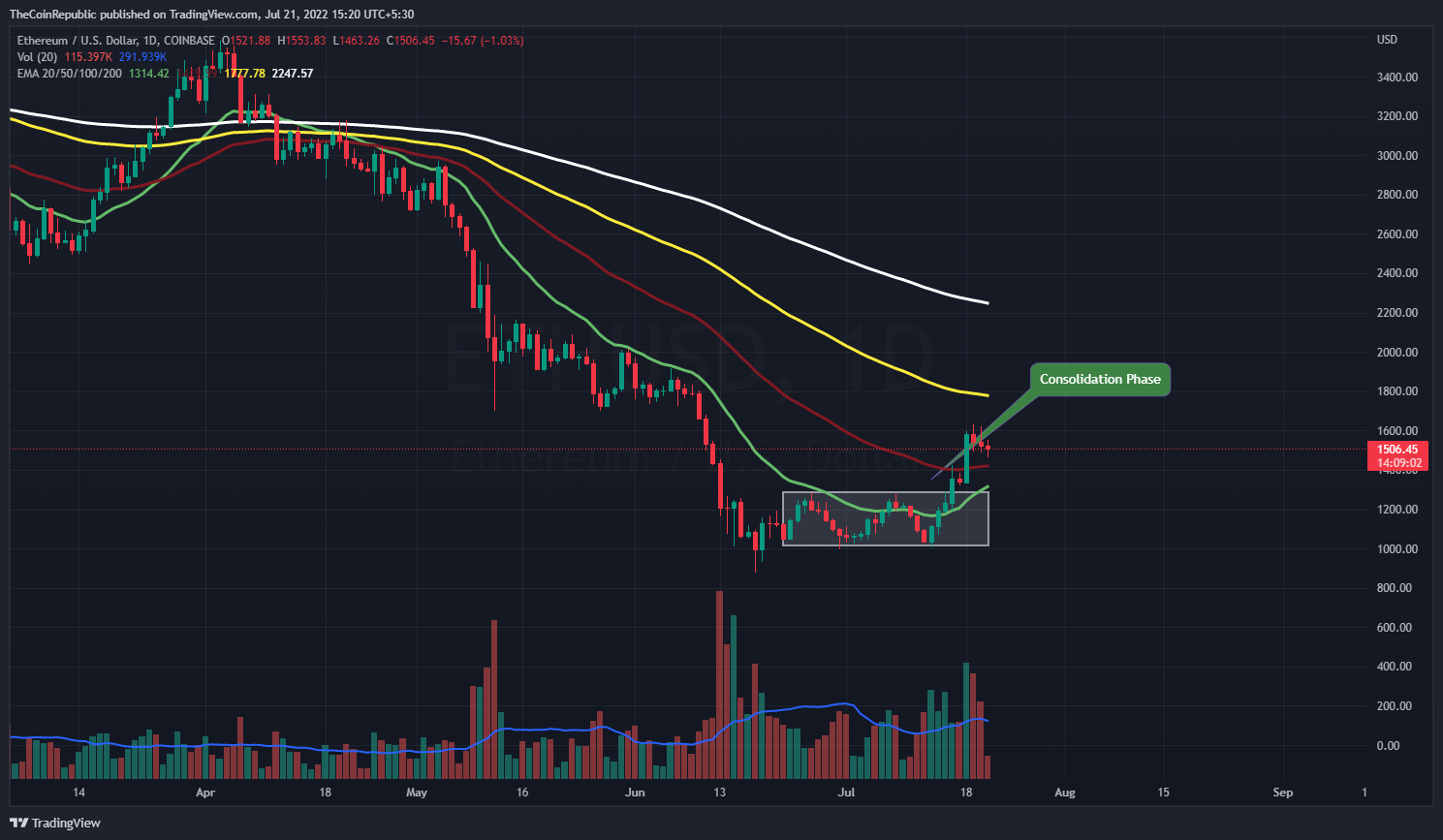 - Ethereum price has successfully escaped the consolidation phase and the token now falters to maintain itself above $1500.