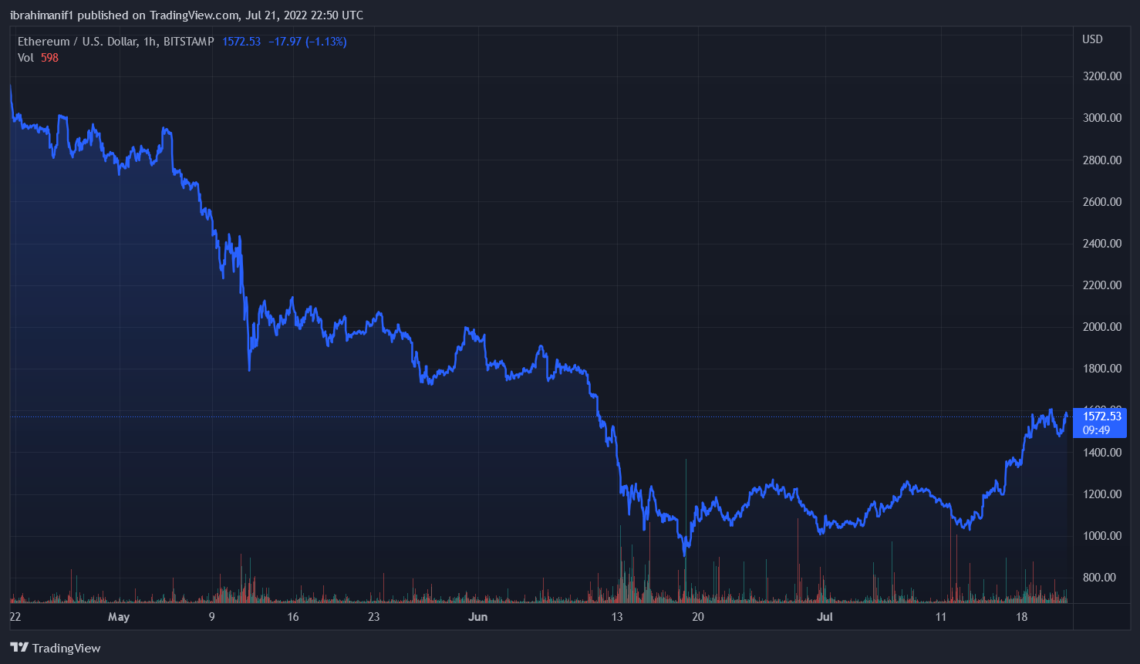 The price of Ether (ETH), which reached a high of $1,620 on July 20, retraced to a low of $1,463 in the early trading hours of July 21, according to TradingView data, and has since recovered back above support at $1,500.