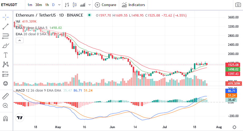 According to the crypto market tracking website, CoinMarketCap, the price of ETH has fallen by 4.61% over the past 24 hours, taking its price down to $1,526.52. As a result, ETH’s market cap totals $185,611,763,589.