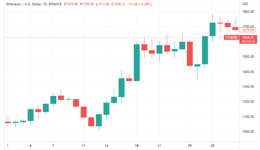 ETH opened on July 1, with a trading price of $1,068.32, reached a monthly high of $1,759.88, tested a monthly low of $1,033.96, and closed at $1,681.52. Overall, this equates to a 57% increase between the opening and closing price of ETH in July.