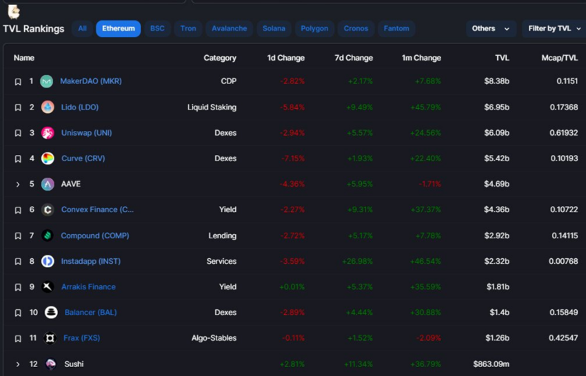 MakerDAO (which has the most TVL in Ethereum) rose by more than 7% in the last month. Lido Finance spiked more than 45% within the same period. Convex Finance and Uniswap saw a 37% and 24% improvement in liquidity in their respective total values locked. Curve was also up by more than 22%. Balancer, Arrakis Finance, and Instadapp also made significant contributions to TVL.