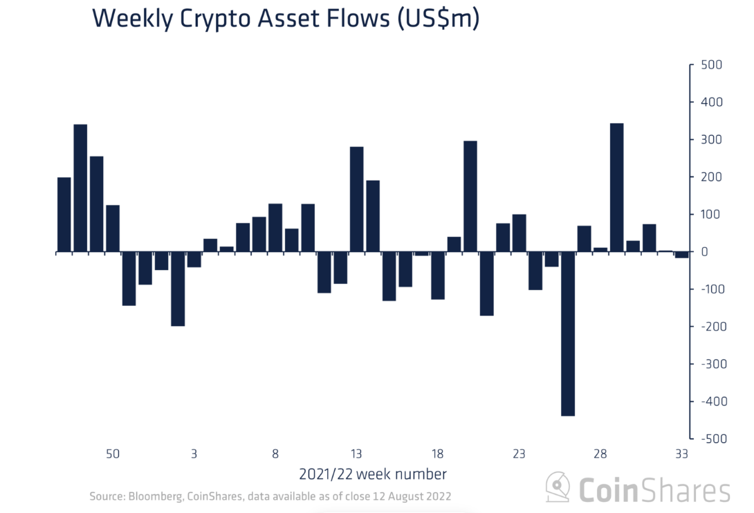 Crypto funds had $17 million in outflows in the seven days up to Aug. 12, ending six consecutive weeks of inflows, according to a CoinShares report.