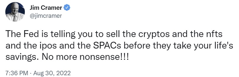 “Look, Fed chief Jay Powell told us that we need to stop doing stupid things with our money. That was the thrust of his speech on Friday,” Cramer said, referring to Powell’s speech in Jackson Hole, Wyoming. The central banker warned that the Fed’s battle against inflation will bring “some pain.”