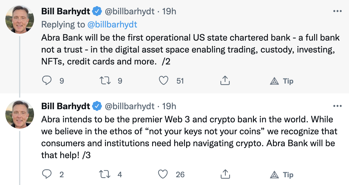 Bill Barhydt, CEO of Abra, took to Twitter to elaborate on the Abra offerings: