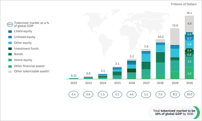 According to Boston Consulting Group, the value of tokenized assets worldwide will exceed $15 trillion by the next eight years, an amount estimated to be equivalent to 10% of the global gross domestic product then.