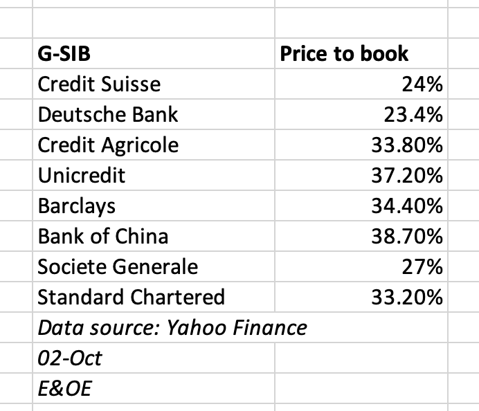 In addition, Credit Suisse follows other European major banks with a low price-to-book valuation, which is a flashing a warning signal according to Alasdair Macleod, head of research at Goldmoney. Furthermore, Macleod worries that a failure of one of these banks could lead to systemic risk of others following suit.