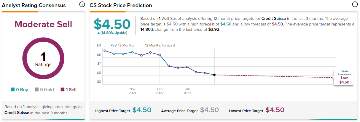 The Sole TipRanks analyst covering CS rates it a ‘moderate sell,’ with the average price in the next 12 months reaching $4.50, 14.80% higher than the current trading price of $3.92.