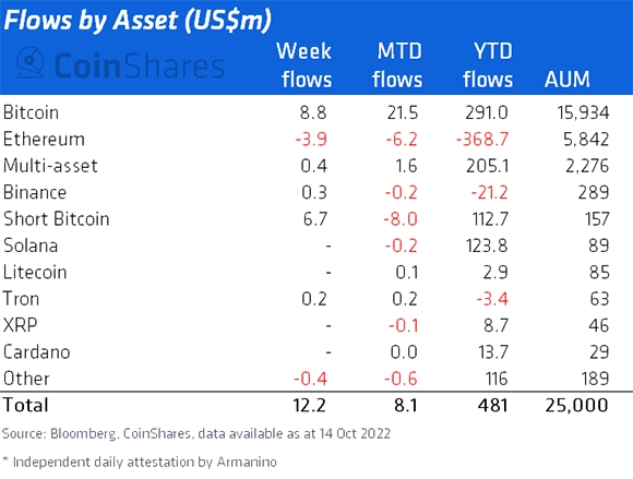 The $12m of inflows into investment products backed by digital assets was made up largely by inflows into regular bitcoin (BTC) funds, as well as short-bitcoin funds that rise in value as bitcoin’s price falls, new data from the crypto research and investment firm CoinShares showed.