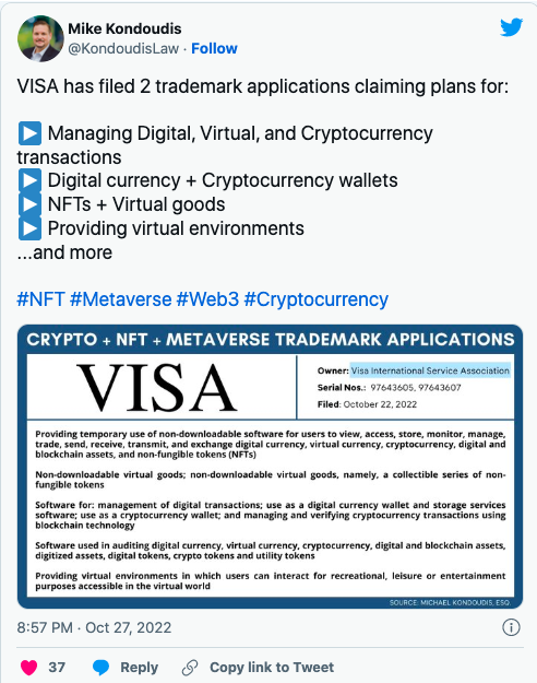 On October 22, the company filed two metaverse trademark applications in order to manage digital and cryptocurrency transactions, cryptocurrency wallets, non-fungible tokens (NFTs), and digital currency.