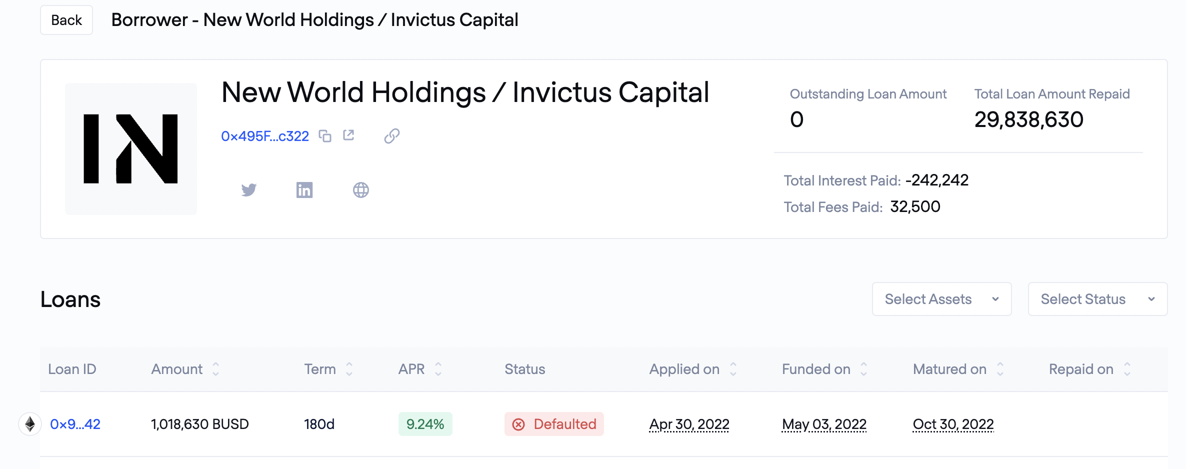 TrueFi warned investors in a Twitter post in early October that Invictus might fail to repay the loan. New World Holdings, Invictus’ Cayman Islands-based parent company, entered into voluntary liquidation after suffering a blow in the crypto rout initiated by the multibillion-dollar implosion of once-top blockchain project Terra. Invictus reportedly moved investor funds to Terra’s failed stablecoin USTC and to crypto lender Celsius Network that went bankrupt in July.