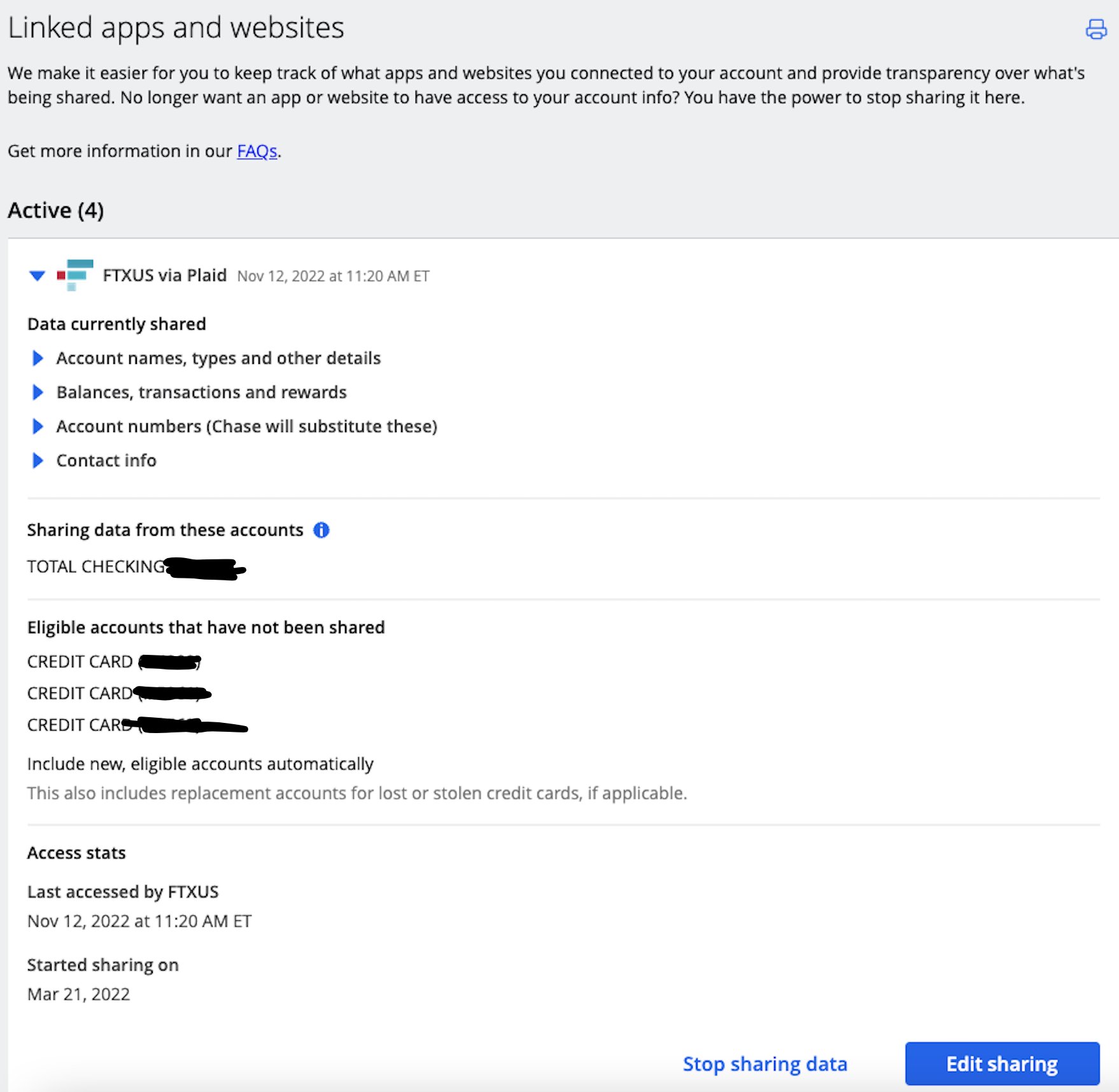 “Although FTX can no longer retrieve any financial data about you via Plaid, if you would like to, you can also use Plaid Portal to revoke access for your individual accounts. You may also be able to revoke FTX access to your individual accounts via your bank’s security center, depending on your particular financial institution.”