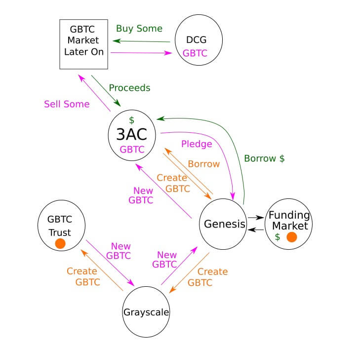 The article broke down publicly available data to assert that Genesis, DCG, Greyscale, and 3AC created a circular infrastructure to borrow and lend BTC to make GBTC shares to “squeeze money from the GBTC premium.”