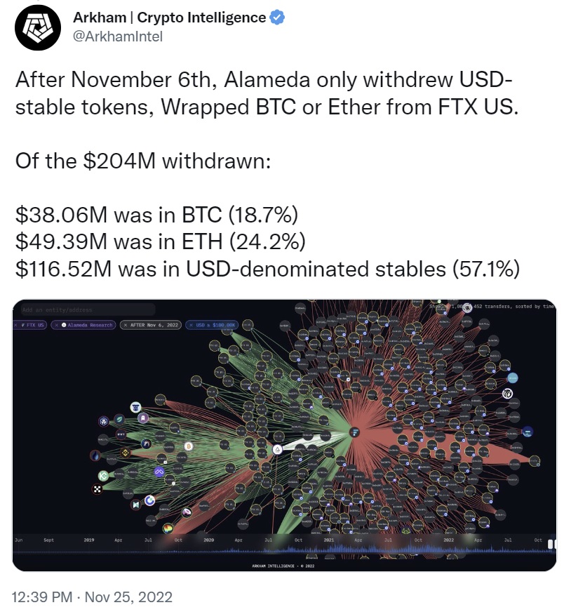 Arkham analyzed flows from FTX US in the final few days before the collapse, finding that Alameda withdrew the most funds, at $204M.