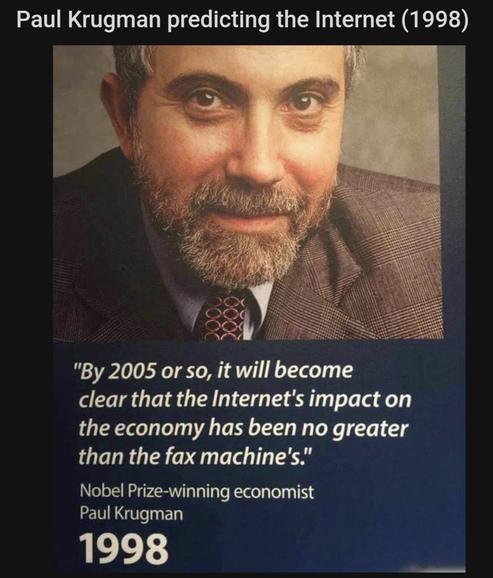 On the other hand there is an old prediction about internet by Mr. Krugman gained attention in which he stated that “By 2005 or so, it will become clear that the Internet’s impact on the economy has been no greater than the fax machine’s.”