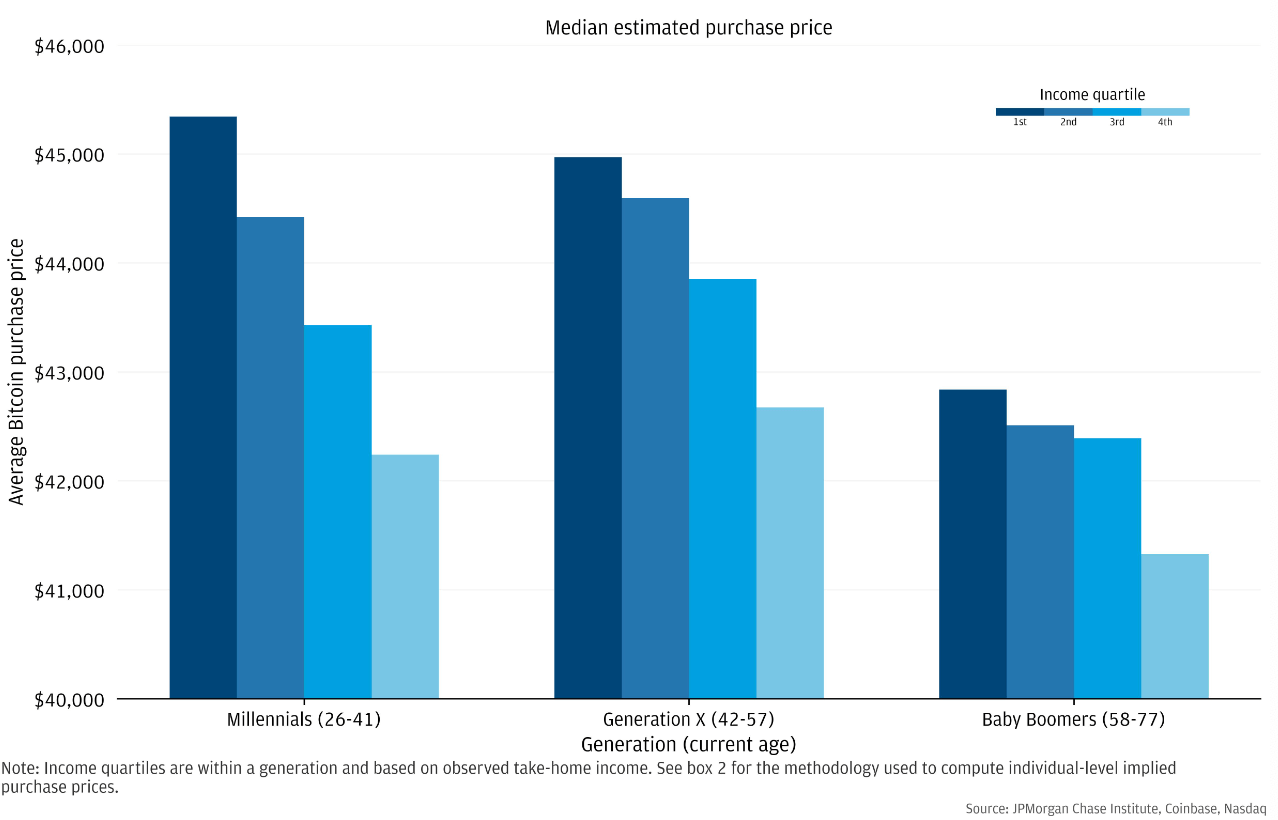 The chart above only considers the millennials and groups them based on their gross income levels. The lowest income quartile appears to have purchased crypto for the first time while the BTC price was lingering around $45,500.