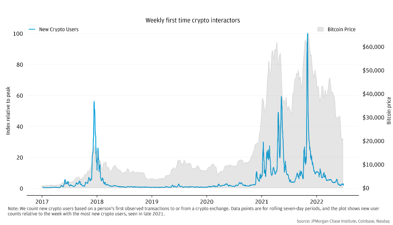 Most users issued their first transactions during the same five months, corresponding with the peak BTC price.