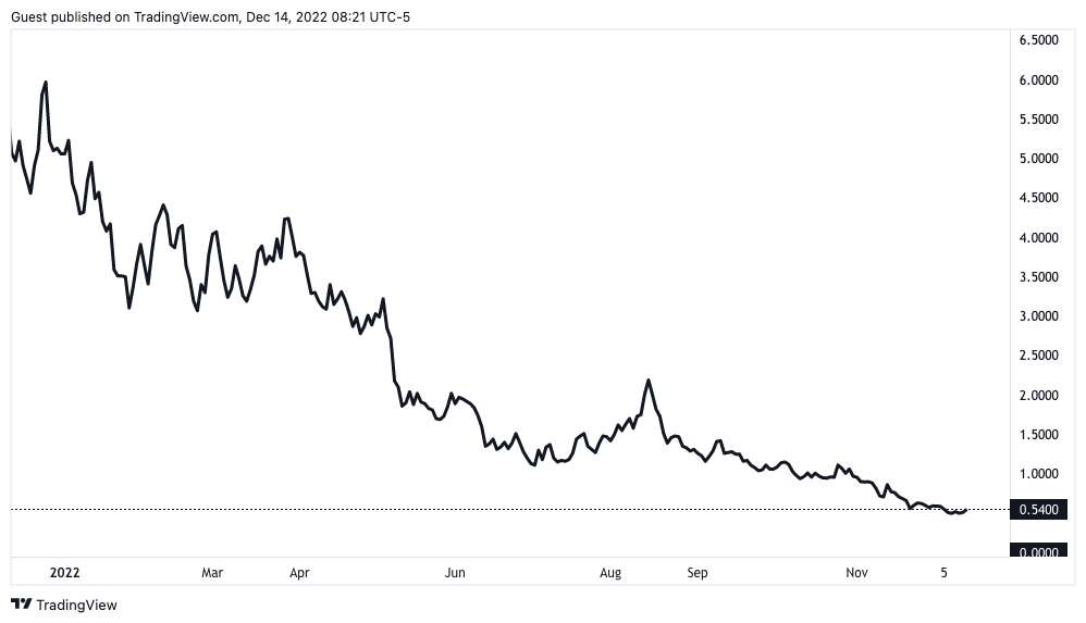 According to data from TradingView, Bitfarms’ shares dropped below $1 in late October 2022 and have not retested the $1 price mark since. Bitfarms’ stock closed at $0.54 on Dec. 13, seeing a 7.6% increase over the day.