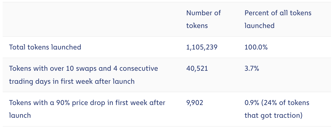 Of the 40,521 analyzed, 9,902 tokens experienced a significant price decline within the first week of their launch — accounting for 24% of all launched tokens.