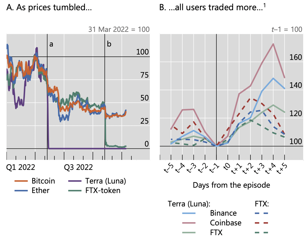 A report from the Bank for International Settlements (BIS) suggested that trading activity on major exchanges increased in the days following the collapse of crypto firms FTX and Terraform Labs.