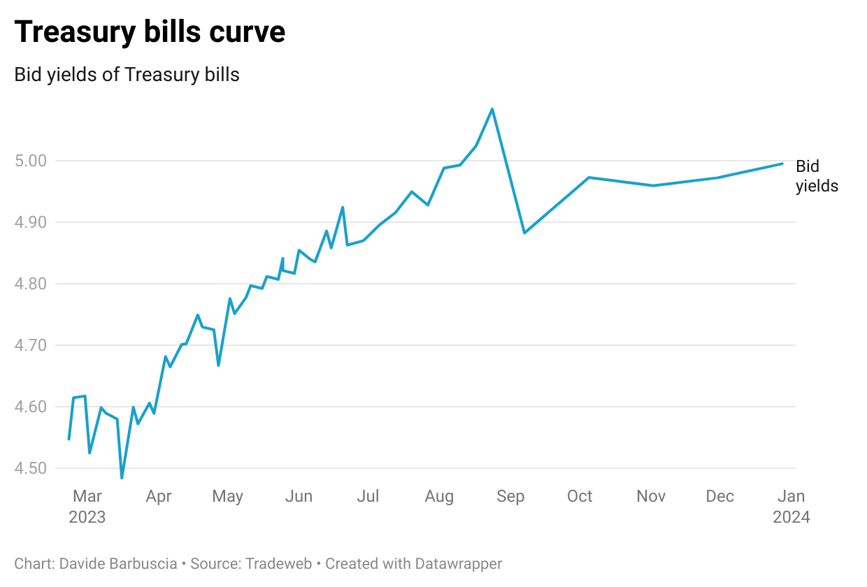 The Treasury bills yield curve shows investors are asking for higher returns to hold debt due in August, flagging that it is deemed riskier than other maturities.