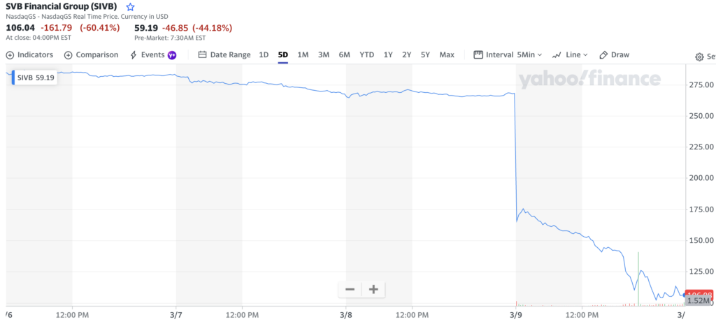 Silicon Valley Bank announced a stock offering of $1.75 billion earlier this week, in addition to a separate purchase of $500 million common stock by private equity firm General Atlantic to shore up its balance sheet. This announcement caused investors to sell their shares, which led to the sell-off.