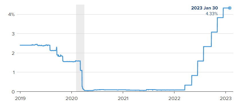 With the upcoming supposed rate rise, the United States central bank is about to complete one year of interest rate hike streak. The Fed is expected to raise the bar by another 25 basis points or 0.25%. Until last year, the rates were around 0.8% which started shooting significantly and reached up to 4.33% in January 2023. The upcoming hike will be eighth in this order and will likely bring the rates beyond 4.5%.