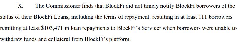 The regulator claimed that BlockFi failed to provide timely notification to borrowers that they could stop repaying their BlockFi loans.