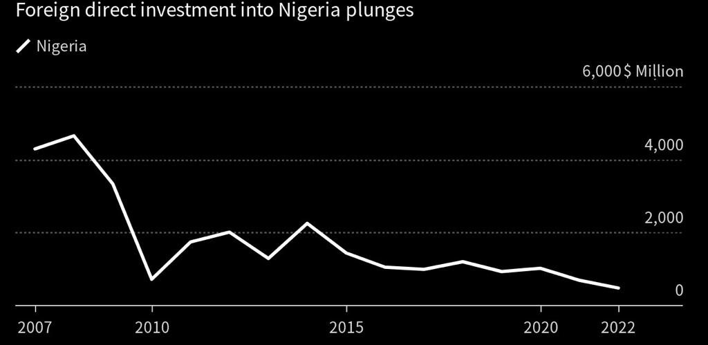 The National Bureau of Statistics (NBS) reported on Tuesday that foreign direct investment (FDI) in Nigeria, the largest economy in Africa, dropped by 33% last year due to a severe shortage of dollars, which discouraged crypto companies from expanding into the country. In 2022, investment declined to $468 million from the previous year's $698 million. According to the data, FDI has decreased by approximately 90% since its peak of $4.7 billion in 2008.
