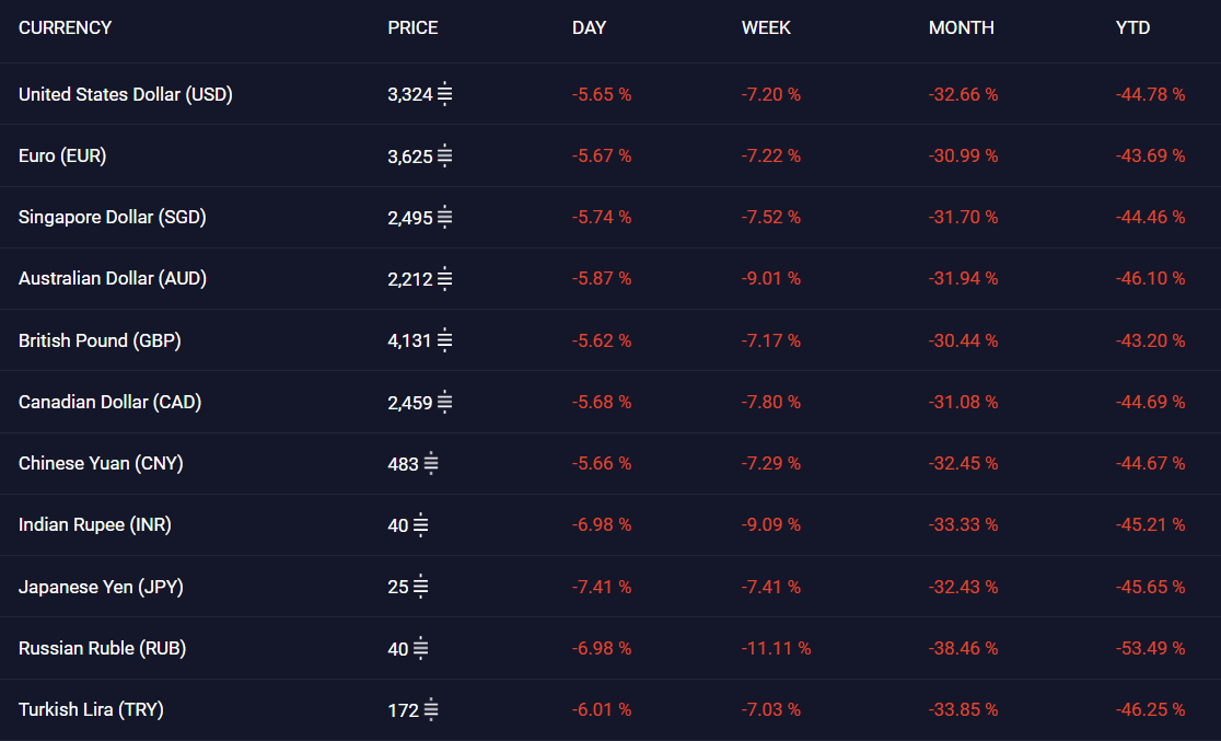 Compared to Bitcoin and other crypto assets, fiat currencies have been going through a bloodbath, continuously losing their value on daily, weekly, monthly, and even year-to-date (YTD) charts, according to the recent data acquired from pricedinbitcoin21, the platform that tracks prices of traditional assets versus Bitcoin.