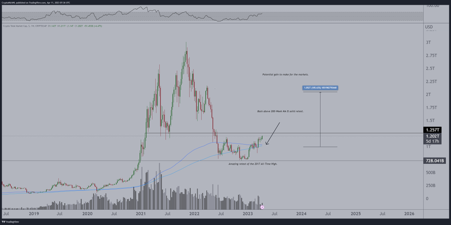 Indeed, the total crypto market cap is currently above the 200-MA (moving average across 200 observed time periods) and 200-EMA (exponential moving average), according to the analysis published by crypto trading expert Michaël van de Poppe on April 11.