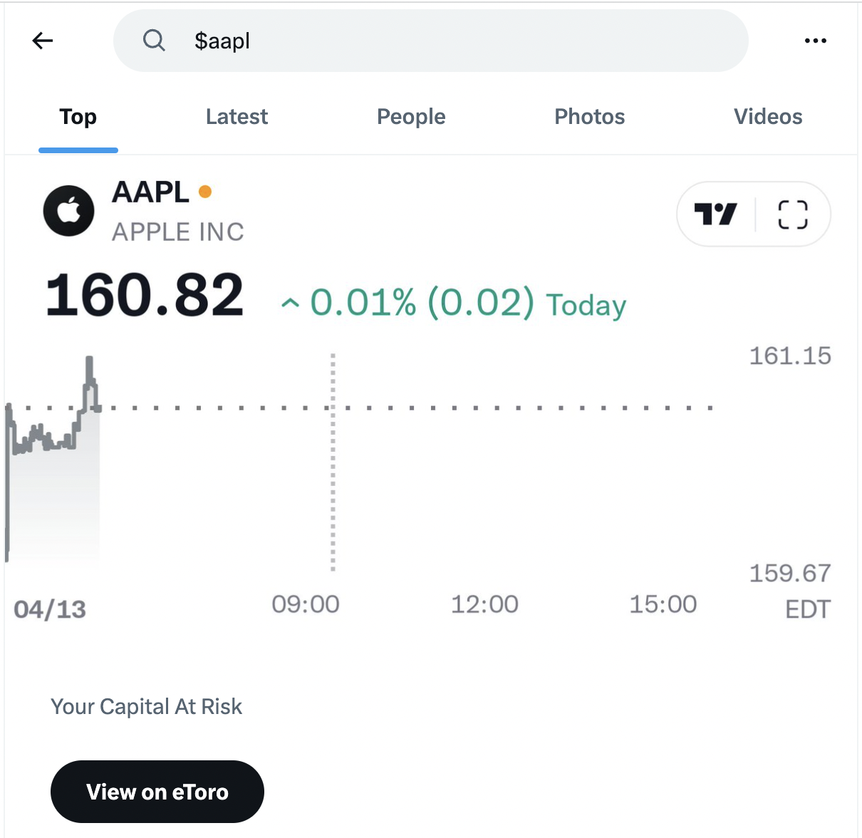 Using the feature is pretty simple. In Twitter’s search tab, simply enter a dollar sign ahead of a ticker symbol you wish to check. The platform will then display price information on a chart generated from TradingView, and you’ll be able to see a “View on eToro” button.