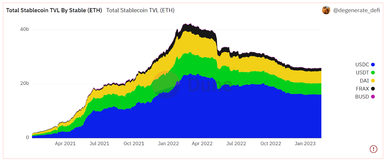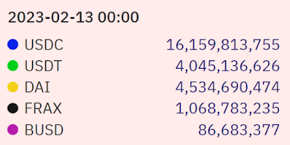 As of February 2023, over $24.5 billion of stablecoins were locked in in the top stablecoins USDC, USDT, and DAI.