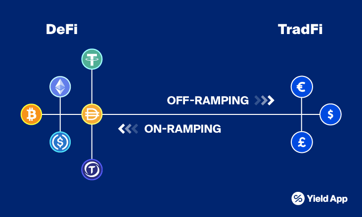 On-ramps are the platforms you use to purchase and enter the crypto ecosystem, while off-ramps refer to converting digital currencies back to fiat.