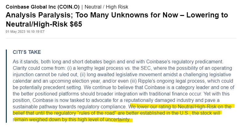 As per reports on May 1, the investment bank downgraded shares of the crypto exchange from “Buy” to “Neutral” and lowered its price target — citing “too many unknowns” as the company battles it out with regulators.