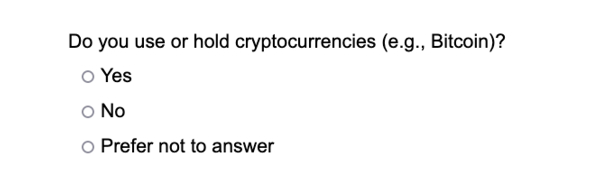 It also specifically asks if the survey taker uses or holds cryptocurrencies and features a range of demographic questions about gender, age, education and income.