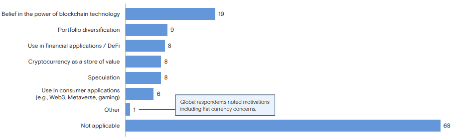 The primary motivation for those who have entered the ecosystem is the belief in the power of blockchain technology (19%). 9% have joined the industry to diversify their portfolios, whereas 8% view digital currencies as a store of value. In addition, 8% have purchased bitcoin or altcoins, hoping to profit in the future or simply speculating.
