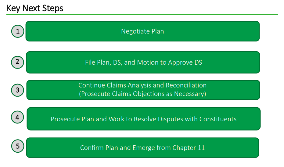 A Chapter 11 bankruptcy allows a firm to continue operating until stakeholders are able to agree on a restructuring plan which could involve measures such as the downsizing of business operations to reduce debt or the liquidation of assets to repay creditors.