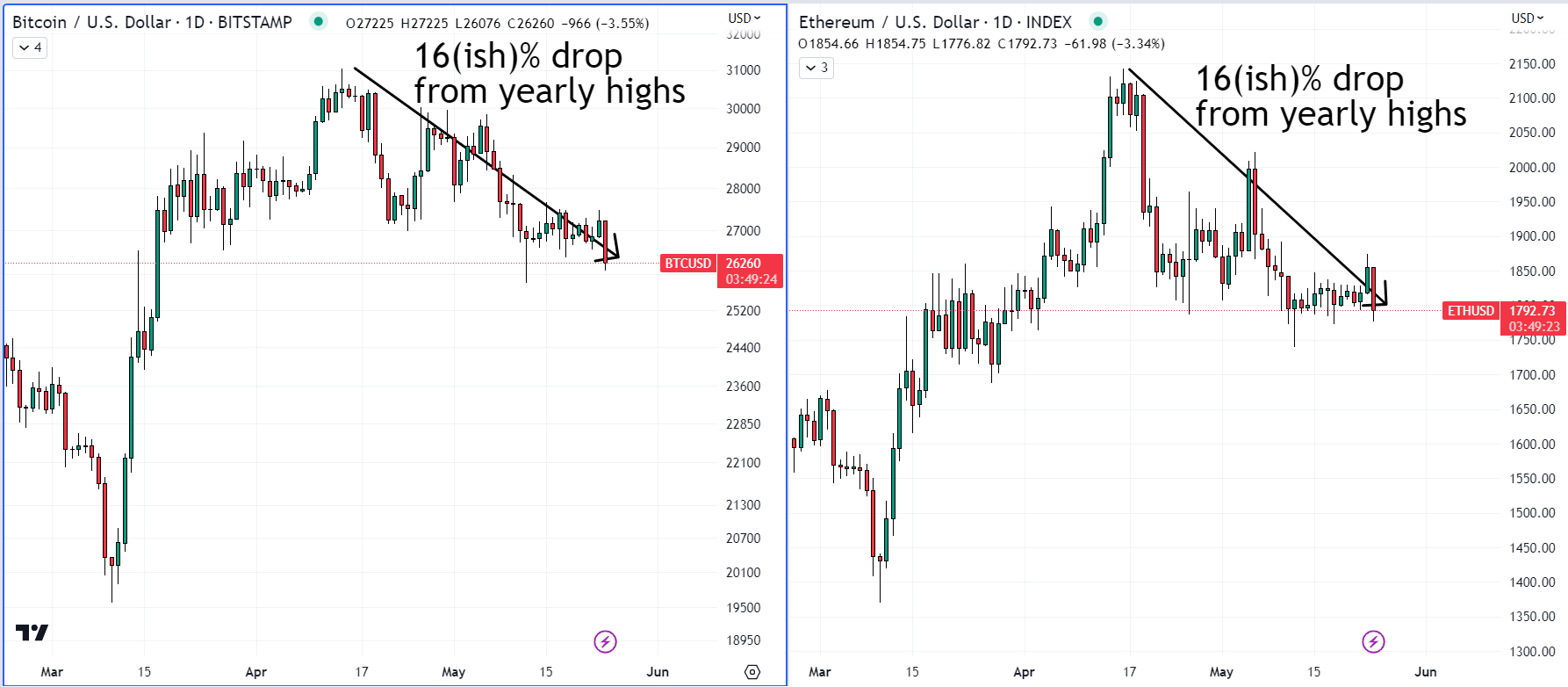 Bitcoin, last in the low-$26,000s, is down over 15% versus its earlier yearly highs above $31,000, while Ether, last trading just under $1,800 is down a similar margin from its earlier yearly highs in the mid-$2,100s.