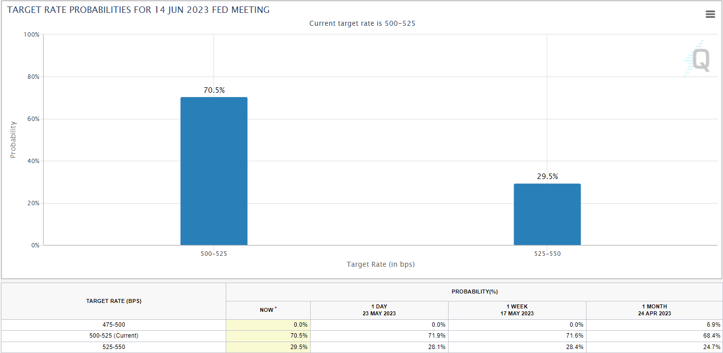 US interest rate future markets were last pricing about a 30% chance that the Fed hikes interest rates against at its 14th June meeting, unchanged from one day ago, according to the CME’s Fed Watch Tool.