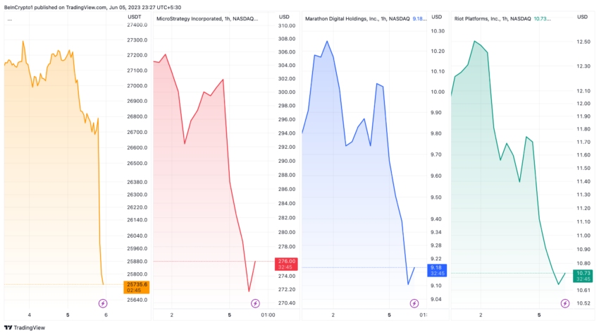 Bitcoin’s price dipped by 5.3%, falling below $26,000 for the first time since mid-March. MicroStrategy, Marathon Digital Holdings, and Riot Platforms stocks also experienced significant declines.