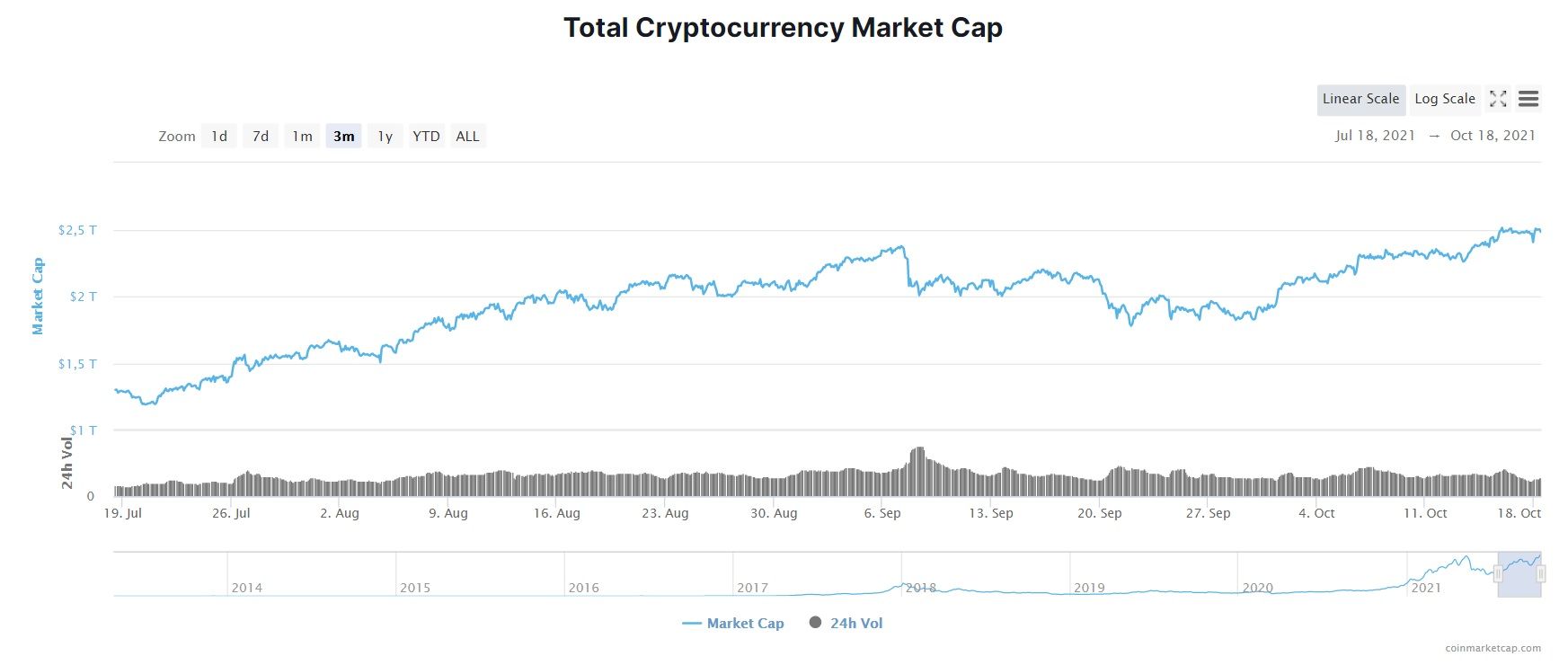 At the time of writing, the value is at around $2.5tn with a 24h trading volume of $91b.