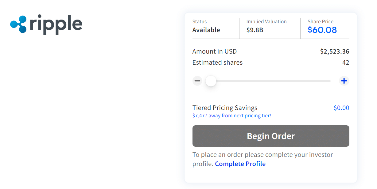 Like in the previous month, interested investors must allocate a minimum of $2,500 to acquire Ripple’s pre-IPO shares. According to the investment page, the stock sells at $60.08 per share. This figure is a 71.4% increase from the $35 value observed on June 1.