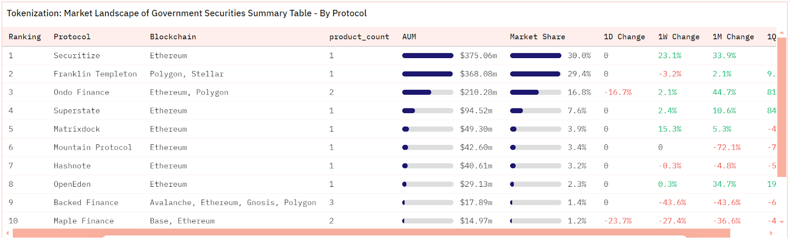 The above image presents the ten largest tokenized government securities with their AUM, market share and 1D, 1W and 1M change.