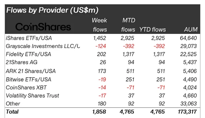 BlackRock continued to lead crypto ETP issuers by capturing $1.5 billion in weekly inflows, which accounted for 76% of all inflows during the period. With $2.9 billion in inflows year-to-date and a total AUM of $64 billion, BlackRock is still the dominant player in the market.