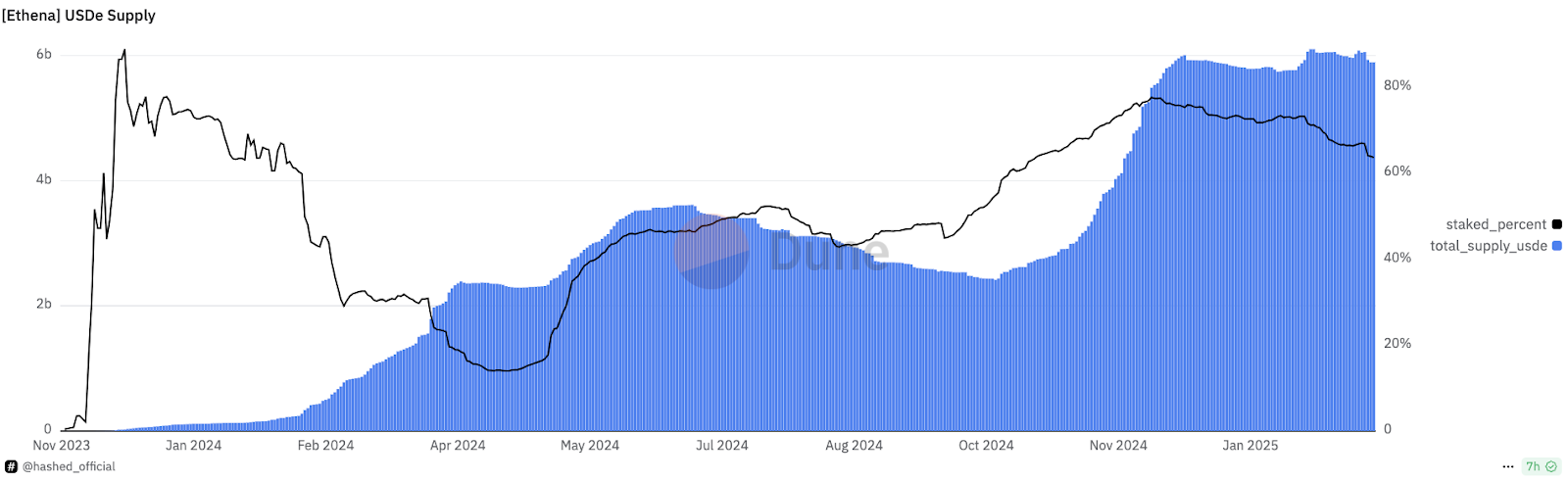 According to the data from Dune Analytics, USDe boasts a supply of 5.8 billion dollars, an increase of approximately 150% compared to the data from May 2024. Despite the growth in the market, since November this algorithmic stablecoin seems to have partially lost the interest of investors, given the drop in the supply locked in stake, which has decreased from 77% to the current 64%.