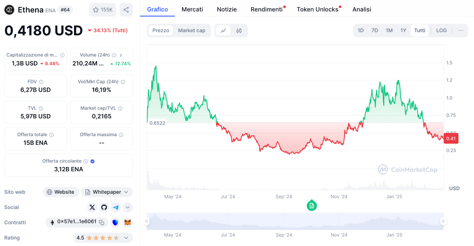 Instead, ENA, the governance token of the protocol with a market capitalization of 1.3 billion dollars, has had a different growth path compared to USDe. This cryptocurrency became very popular in Q2 2024, when it was launched on the market with an airdrop dedicated to Ethena users. Following this, there was a temporary bear wave that caused ENA prices to drop, but it was quickly recovered with the bull push from Donald Trump, who purchased the coin with his World Liberty Financial project. Now ENA is traded at 0.41 dollars, down 67% from its local high in December at 1.27 dollars.
