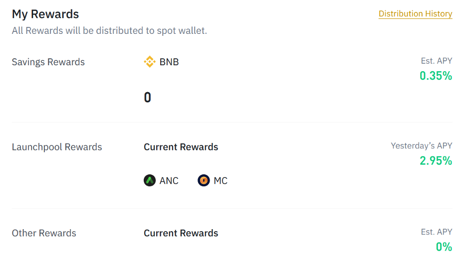 As with lending, this “interest” is usually paid in the platform’s own token—and they want you to stake that token, too. For example, the crypto exchange Binance has its own Binance token (BNB), which you can stake in its platform (called “Vaults”). The revenues that Binance earns on its platform — when people make trades — are then distributed back to stakeholders: that’s your “interest,” paid in BNB.