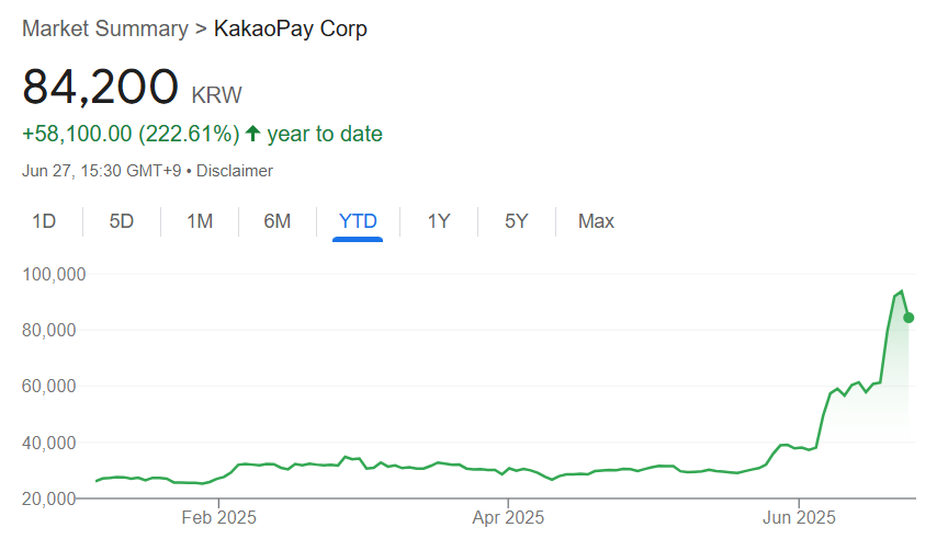 Recently, the shares of Kakaopay broke their 2025 rally, coming down from their peak. Kakao Pay Corp. traded at a peak of 93,800 KRW ($69.17), recently dropping to the equivalent of $62.09. The shares lost 15% in a single day after the company received warnings on its own attempts to use stablecoins. The stablecoin narrative boosted the share price by 200% in June, before the recent setback.