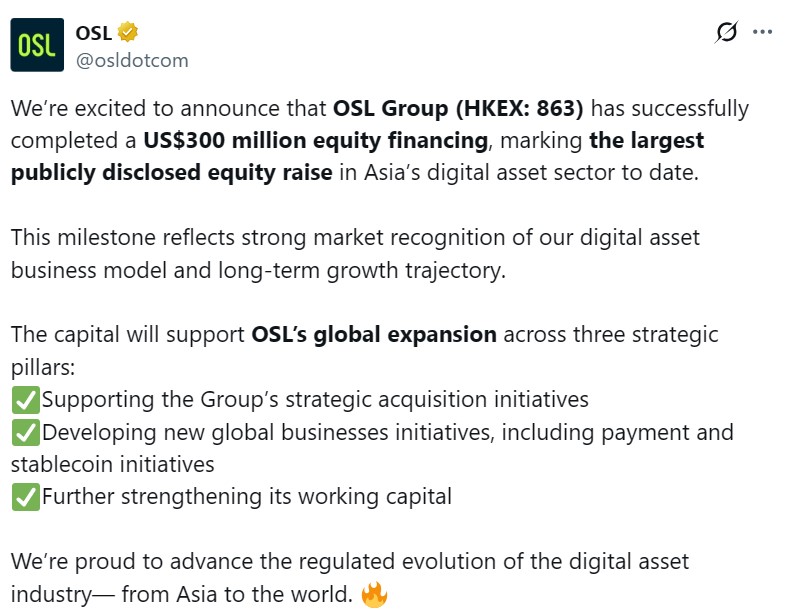 “This US$300 million equity raise marks a major milestone in our journey and reflects strong conviction in OSL’s digital asset strategy and execution,” said Ivan Wong, the chief financial officer of OSL Group.